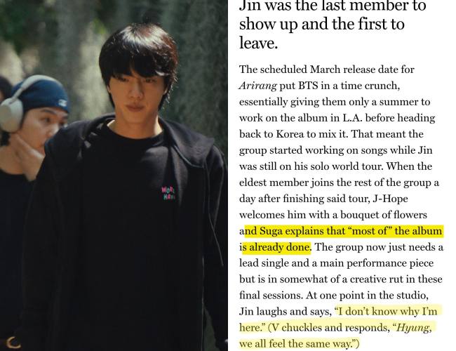 As if that weren’t enough, a recent article citing a BTS documentary added fuel to the fire. The report mentioned Jin’s absence from many stages of the music-making process and described the moment when the members reunited with him for the first time at a songwriting camp in the U.S. after he finished his schedule. Some highlighted excerpts included: “SUGA explains that most of the album is already done” and “Jin laughs and says, ‘I don’t know why I’m here.’”