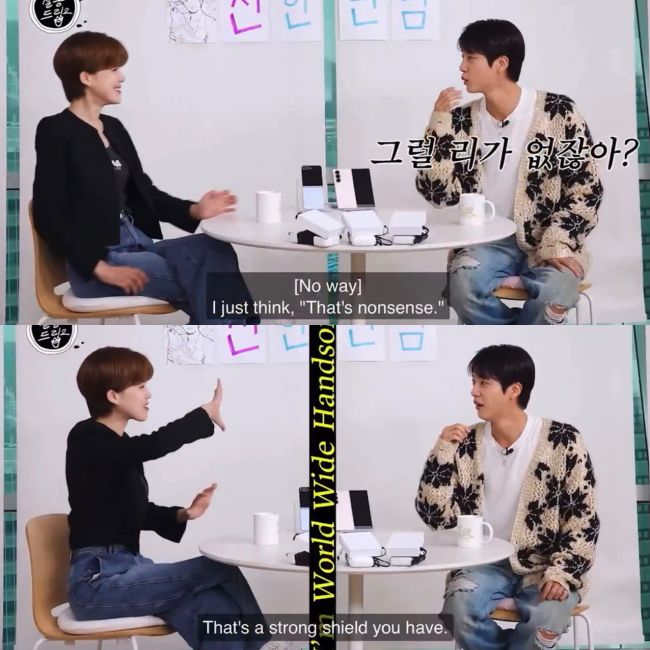 Jin went on to add, "Because of that mindset, and I think I’m handsome too so I confidently tell people that I am." The key point, he explained, is this: “When someone tells me I’m ugly, I laugh it off. I just think, “That’s nonsense’”. He treats such attacks as “jokes” and “lies” because he is confident in himself, loves himself, and clearly understands his own worth.
