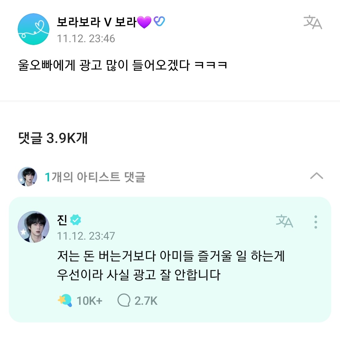 ...And Jin replied in the comment section in a straight and cool way: "To be honest, doing things that armys will enjoy is a priority to me than making money, and that's also why I don't really do commercials."