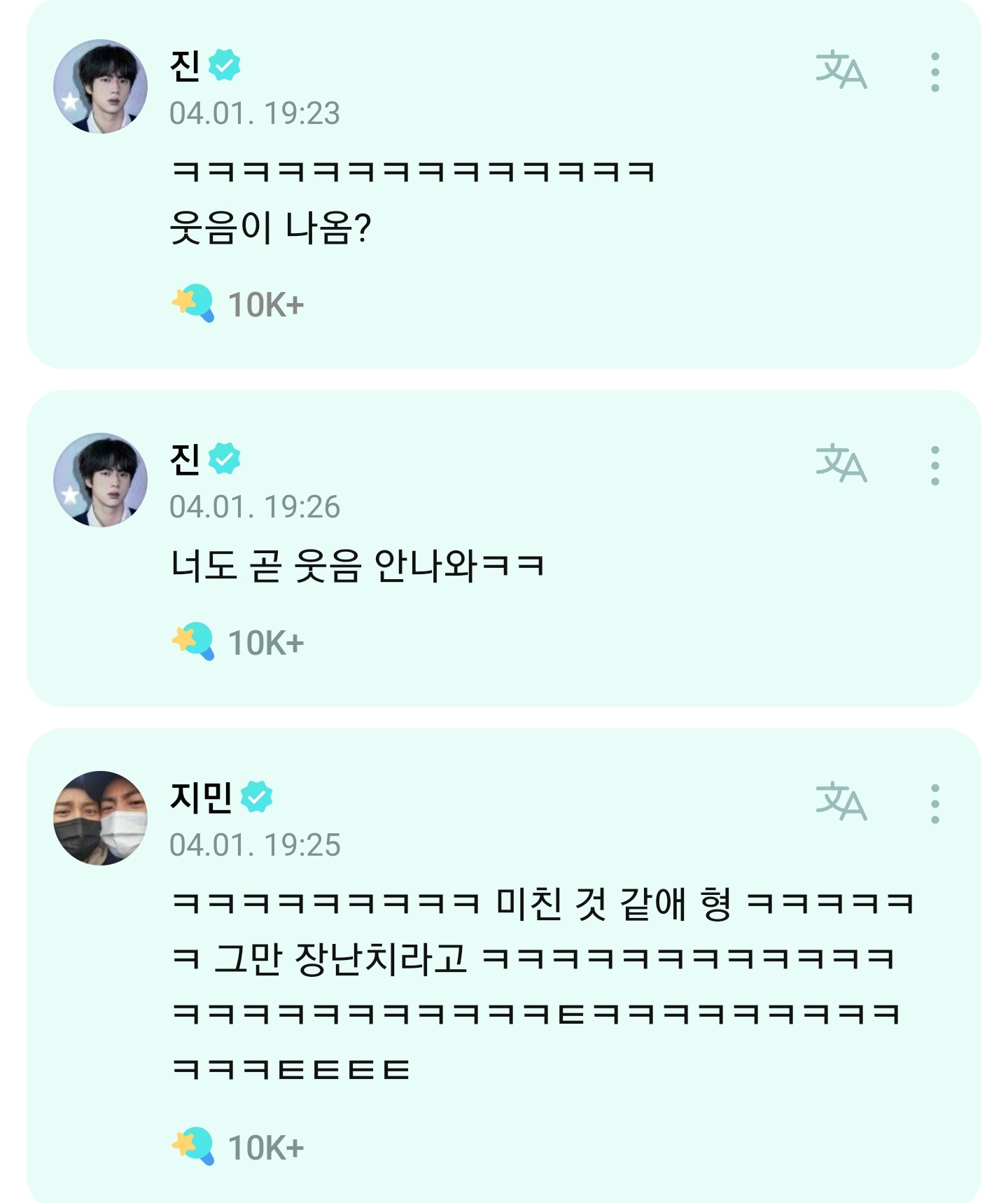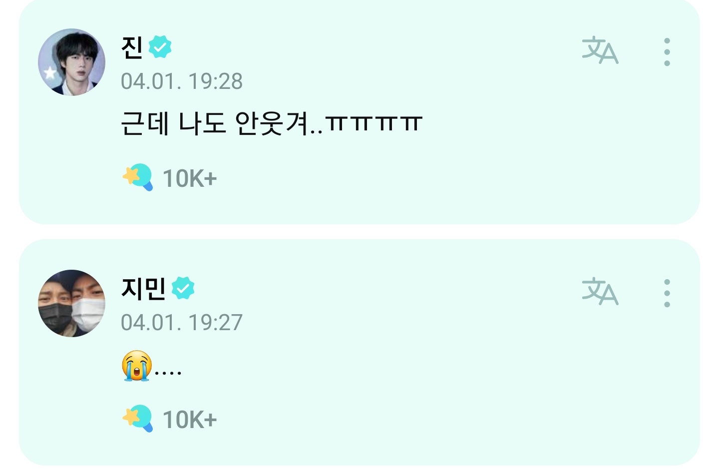 After that, Jin remained serious and said to Jimin: "You also won't be able to smile soon". Then Jimin left a crying icon and Jin answered him that: "But it's not funny to me either..ㅠㅠㅠㅠ"