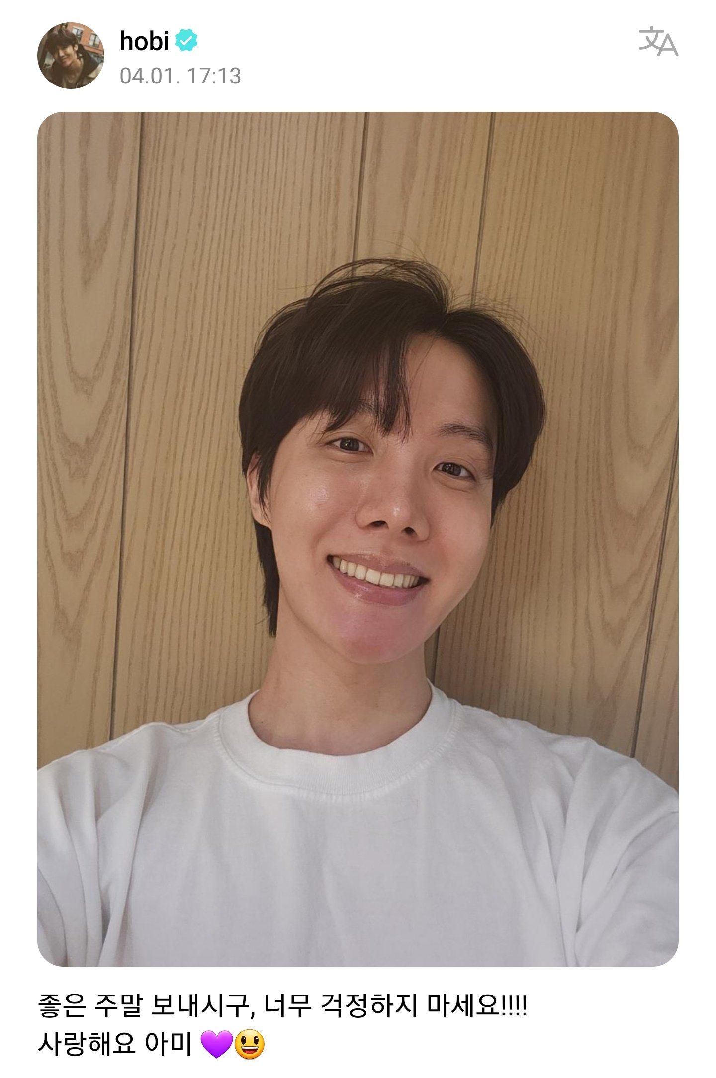 j-hope posted the photo with a big smile and comforted ARMYs that he still hasn't left immediately: "Spend your weekend well, don't worry too much!!!! Love you ARMY"