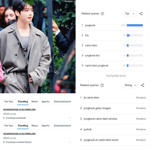 On Google Trends, Jungkook reached a peak search score of 100%, becoming the only artist to enter the global and U.S. Top 10 trending list (while the other terms were only brands or events). This is not to mention the thousands of domestic and international articles tied to the keyword Jungkook – Calvin Klein.