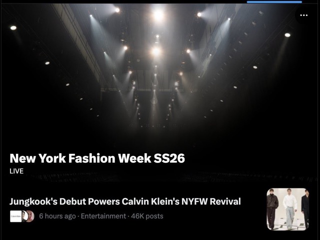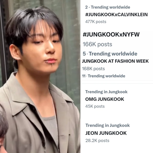 The hashtag #JUNGKOOKxCALVINKLEIN trended at the top on X and Instagram for hours. Related hashtags about Jungkook occupied the Top 2–5 Worldwide Trending spots. “Jungkook’s NYFW appearance” climbed to No.1 across most categories: Entertainment, Fashion, Music, and News.