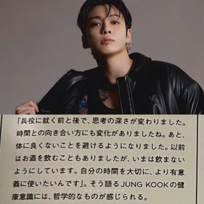 In this context, Jungkook revealed an important turning point after his discharge from the military: changing several old habits that were not beneficial to his well-being, including drinking alcohol. He shared: “Pre and post-enlistment, the depth of my thinking changed. My attitude toward how I use time changed too. I also started avoiding things that aren’t good for my body. I used to drink occasionally, but now I try not to. I want to value my time and use it more meaningfully.”