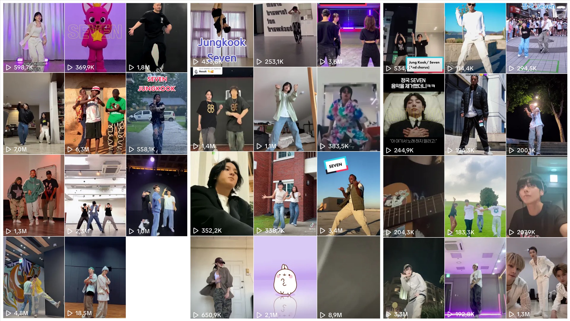 Most of Jungkook's "hєαrtвrєαkíng" videos over the past few days are videos of colleagues and fans showing the choreography of his solo song "Seven". He also enjoys the collages made by ARMYs about him or the BTS members. Occasionally, he also watches funny videos and popular memes on the platform.