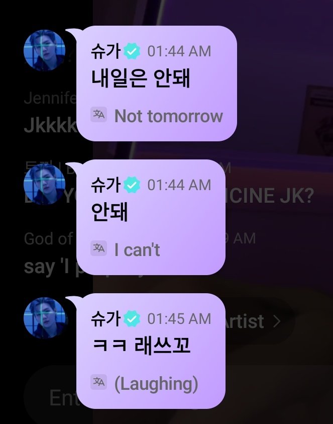 But the conversation is even more interesting when SUGA joins the topic. It seems that SUGA learned about Jungkook's story from someone and he immediately joined the live broadcast. After hearing Jungkook apologize and beg for a chance from him, he was quick to respond: "Not tomorrow. I can't".