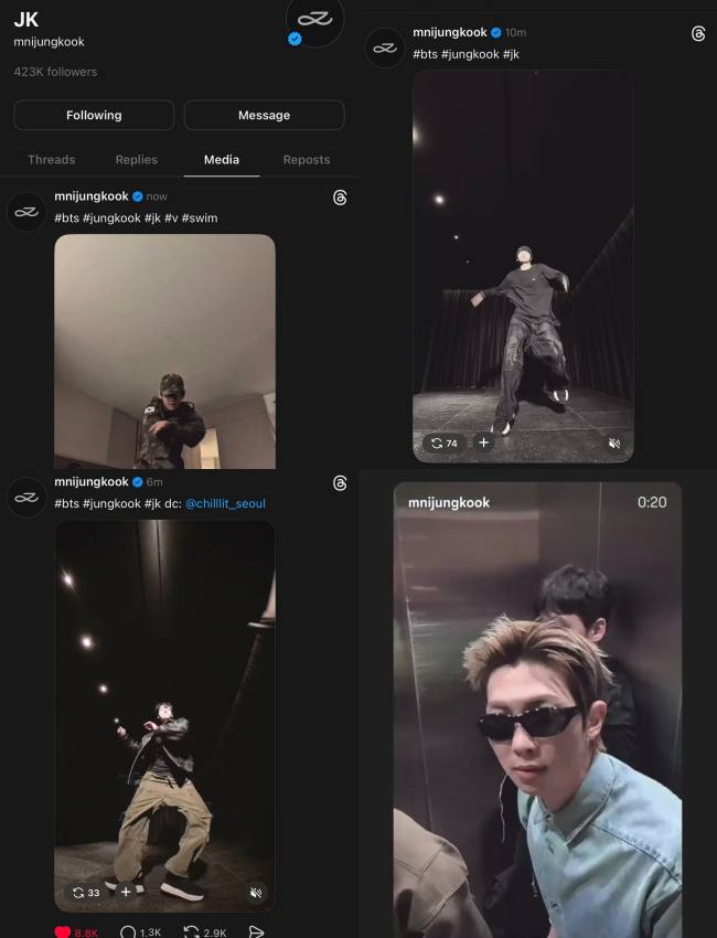As if that wasn’t enough, he also “revived” his long-inactive Threads account by consecutively posting dance challenge videos he had recently shared on TikTok, including a Swim dance challenge with V. On the morning of the 27th, he even added a new video filmed in an elevator with BTS members, set to Swim, further reinforcing the promotion of the title track.