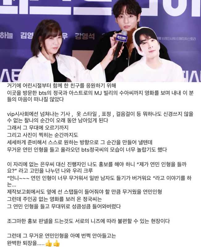 In her post, Ha wrote: “Seeing BTS’s Jungkook holding the heavy doll on stage was so ѕнσ¢кing. My crew and I were discussing whether to use the doll instead of Cha Eunwoo, since he couldn’t be there, but Jungkook asked, ‘Should I carry the doll?’ Our staff stated, ‘Unni, the doll is so heavy that it’s even hard for a grown man to hold it.’ It was so heavy that the staff had to help hold it up during the press conference.