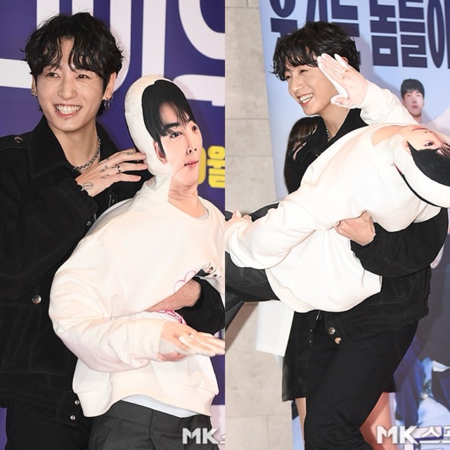 The doll had been prepared by the film’s production team as a stand-in for the actor, who enlisted in the military at the end of July. Before Jungkook’s appearance, the large doll had already been used for several of the movie’s promotional events.
