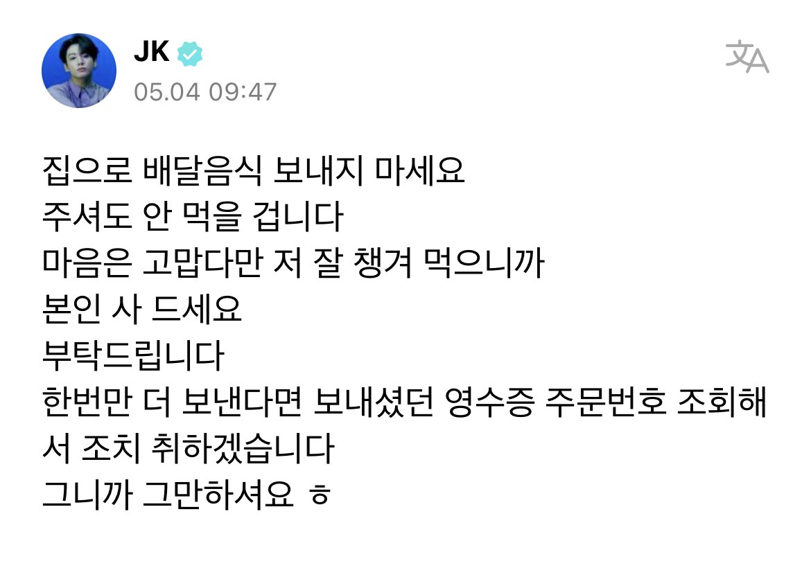 At that time, Jungkook had to speak up to warn against such excessive actions: "Please do not deliver food to my house. I will not take it even if you offer. I understand the gesture was nice but I can take care of my own meals, so please buy it for yourself. I’m really asking you here. In the case that you try to do this again, I will have to reference the order number on the delivery receipt to take appropriate [ℓєgαℓ] action so please stop hah".