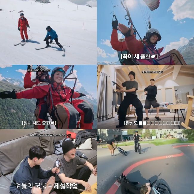 Episode 3 revolves around various activities the young BTS duo take on—from a paragliding challenge that required a great deal of courage as they had never tried it before, to skiing and cycling. It also captures many adorable everyday moments such as a late-night conversation with RM, Jimin practicing j-hope’s “Killin’ It Girl” dance challenge, chaotic mealtimes, and the fun daily habits of global superstars.