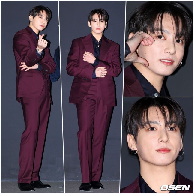The first official event following Jungkook’s partnership with Hublot was the Global Ambαѕѕador Photocall held on the 12th at STRX House in Nonhyeon-dong, Gangnam District, Seoul. Jungkook immediately captured everyone’s attention in a deep burgundy suit. He paired it with a black shirt underneath, slightly unbuttoned in a casual manner, adding to his natural allure. The highlight of his outfit was his bold, statement earrings.