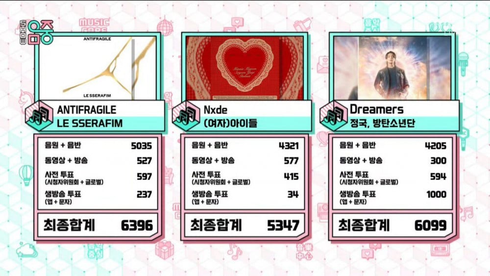 'Programme! Music Core' then provided feedback on taking statistics from Circle Chart (formerly known as Gaon Chart). According to Circle Chart, HYBE has yet to submit the "Dreamers" music video for review, so it has been dropped from the YouTube criteria. Therefore Dreamers get 0 points.
