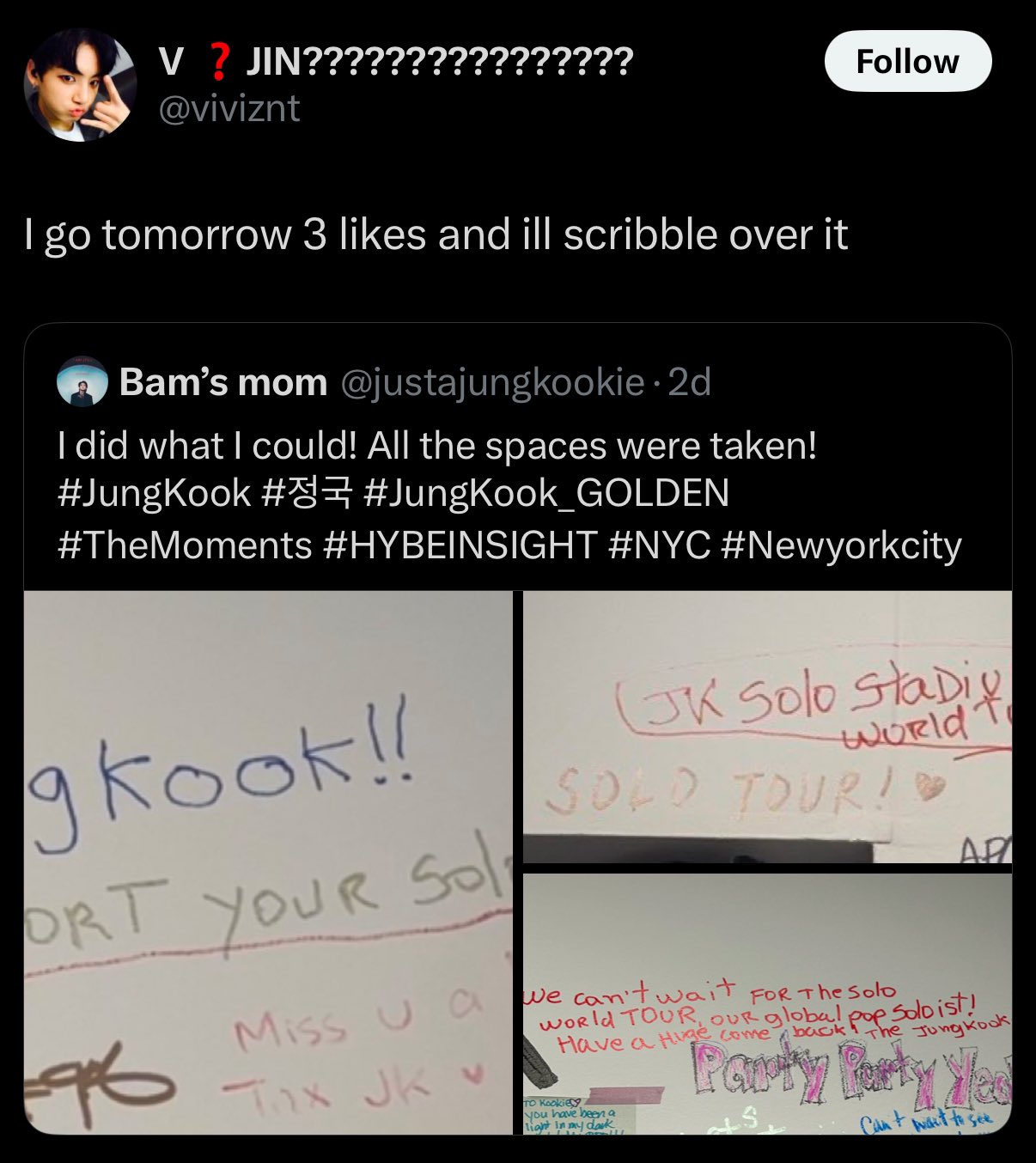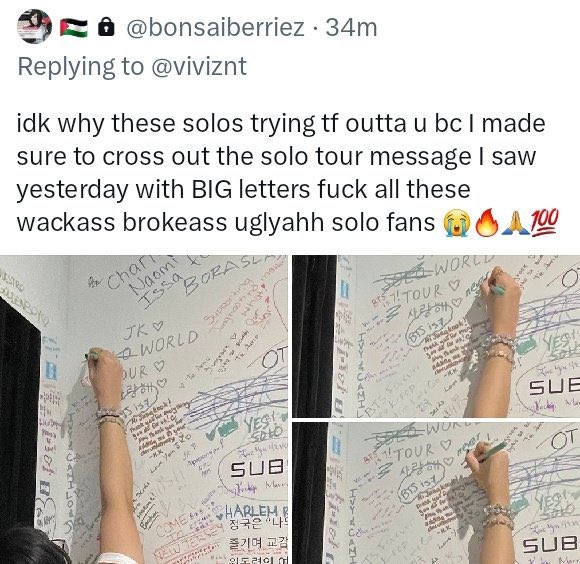 - This is unacceptable. I don’t care how you dislike or beef w/ solos but this is crossing the line and disrespectful to Jungkook! These messages are FOR HIM but you think just bc you self-id as ARMY you have a right to vandalize his message wall containing the fans’ messages…