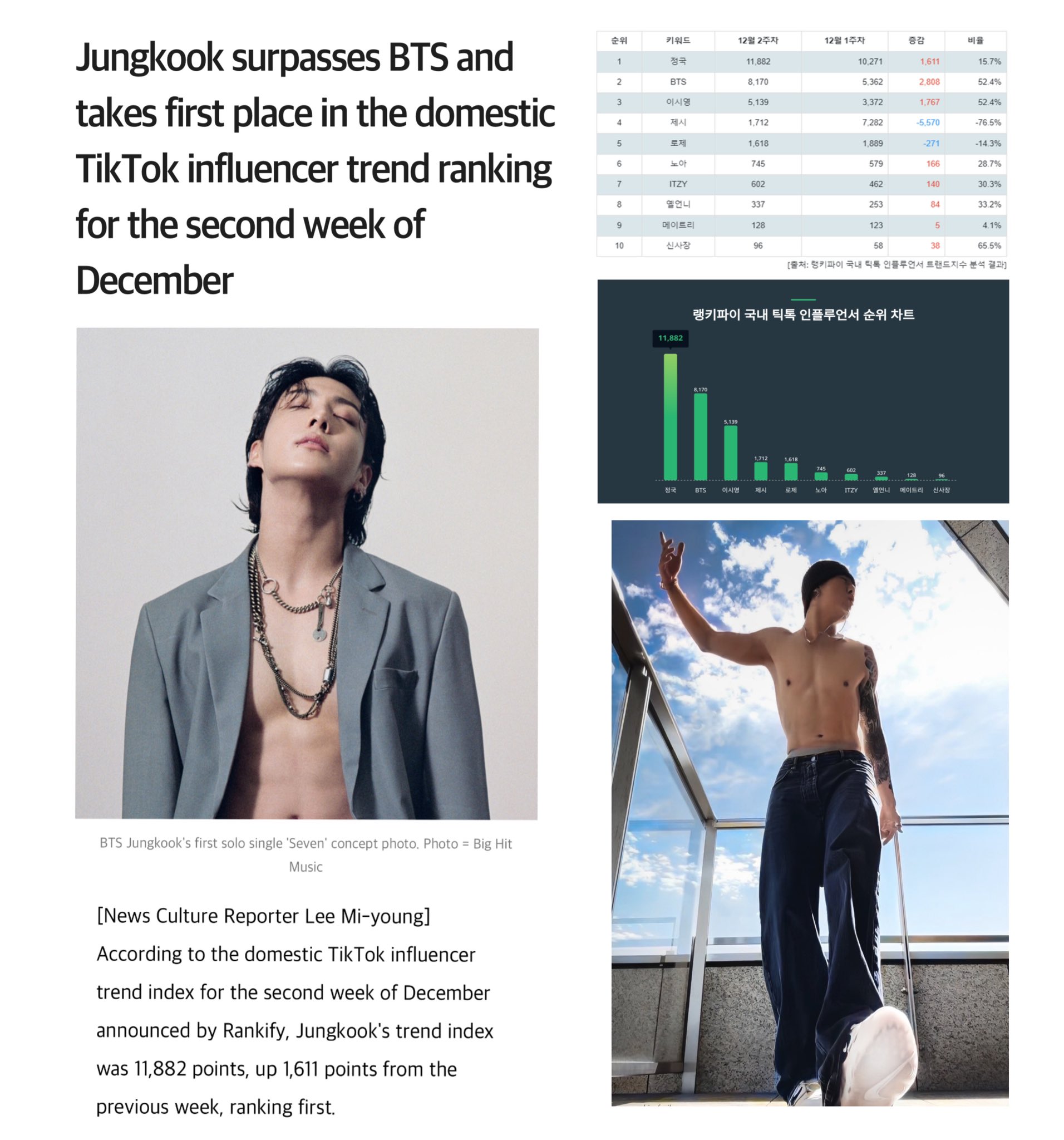 In the 2nd week of December, the results had an amazing change when witnessing Jungkook "surpa̾s̾sing" BTS to takes first place in ḳöŕệä’s TikTok Influencer Trend ranking for the 2nd week of December. Specifically, he tops with 11,882 trend index points, up 1,611 points from the previous week while BTS ranks second with 8,170 points. In which, 1st place Jungkook was preferred by 29% of men and 71% of women. He also was found to be preferred by 7% of teenagers, 19% in 20s, 29% in 30s, 30% in 40s, and 16% in 50. He ranks first in the trend index with 'Jungkook's m̴i̴l̴i̴t̴a̴r̴y̴', 'Jungkook's tattoo', and 'Jungkook's Instagram' as related search terms that attracted the most attention.