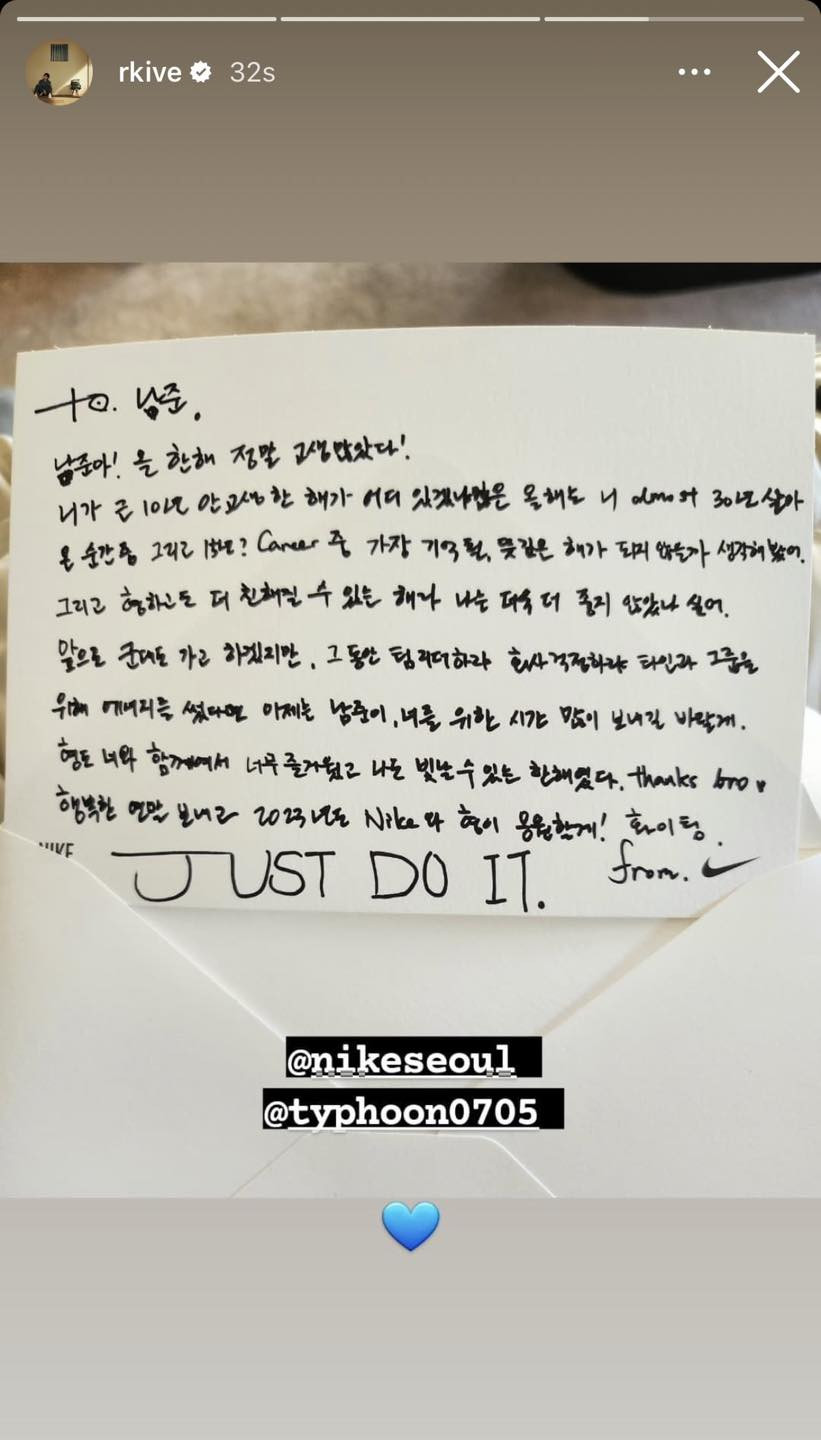 In addition, recently, the Influencer Marketing Director of Nike Lee Tae Joon also RM's close friend sent him a letter thanking him for his dedication in the past year. At the same time, the close friend as well as the director accidentally revealed that RM will soon enlist in the army with the message in the letter.