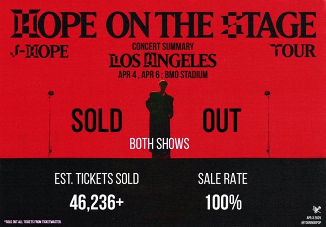 According to reports, tickets for the two 'Hope on the Stage' shows at BMO Arena in Los Angeles on April 4 and April 6, 2025 were completely sold out. On these two nights, 46,236 tickets were sold, achieving a 100% sell-out rate.