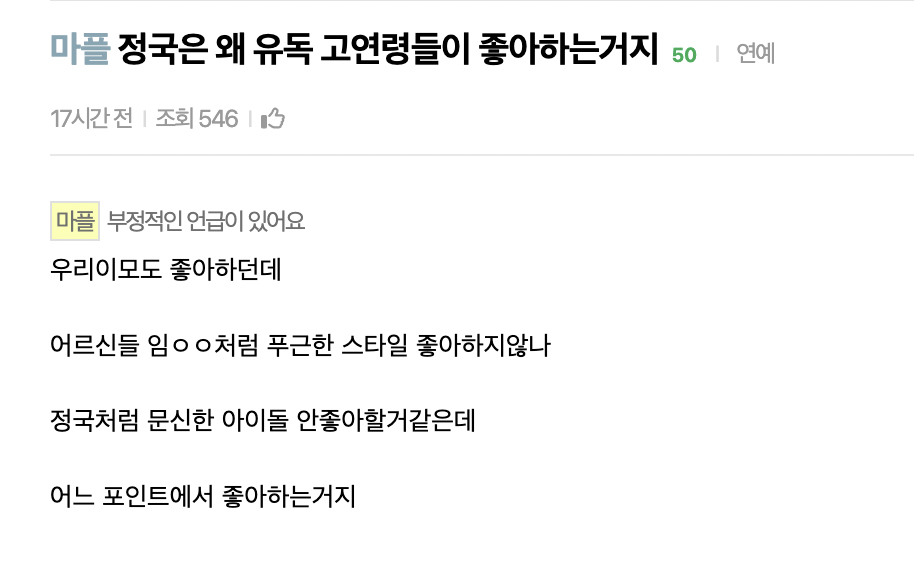 She wrote: "Why is Jungkook especially loved by older people? My aunt likes him too. Don’t older people like warm styles like Lim Young Woong? I don’t think they would like idols with tattoos like Jungkook. What do they like about him?"