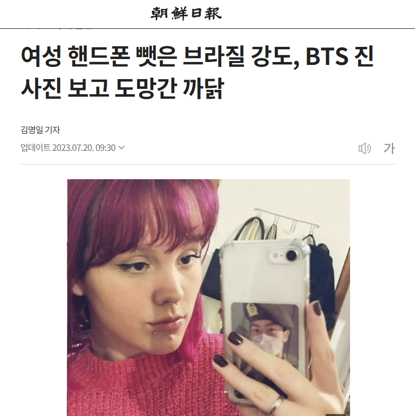 After that, Natalie understood the reason why the thief ran away after that. Natalie said she carried a photo of Jin in m̷i̷l̷i̷t̷a̷r̷y̷ uniform on the back of her phone. According to her, the robber took her phone but after seeing a picture of Jin in a m̷i̷l̷i̷t̷a̷r̷y̷ uniform, he thought it was her boyfriend.