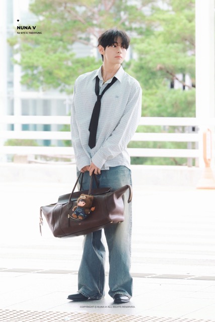So it’s no surprise that this morning, V appeared with a Hirono Living Wild doll – Fight for Joy attached to his trendy brown handbag. This is a new POP MART doll designed in collaboration with Japanese artist Hirono, released this June.