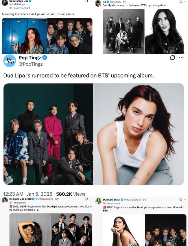 Amid the rapidly intensifying excitement, an even more ѕнσ¢кing piece of news emerged on January 5, directly related to the title track of the fifth album. Numerous major music media outlets and influential social media accounts—from international entertainment platforms to fan communities of global star Dua Lipa—simultaneously reported that Dua Lipa would be participating in BTS’s upcoming album.