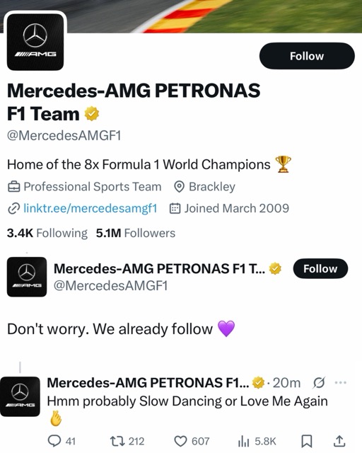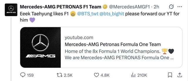 Directly under a fan’s post translating V’s words on X (formerly Twitter), Mercedes’ official account (with over 5 million followers) excitedly replied: “Eeek Taehyung likes F1? @BTS_twt @bts_bigнιт please forward our Youtube for him?” along with a link to their official YouTube channel: https://www.youtube.com/@MercedesAMGF1 "