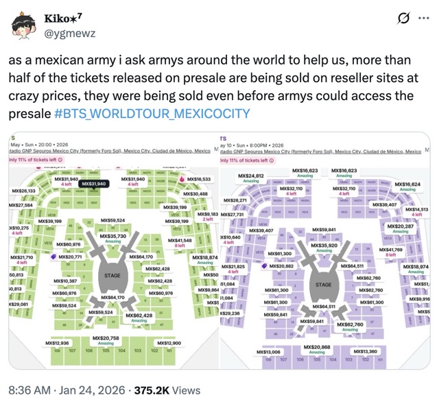 Specifically, only a few hours after the pre-sale closed, Mexican ARMYs found that more than half of the tickets were already being resold on secondary marketplaces at exorbitant prices. This meant that over half of the genuine fans in the country were unable to purchase tickets to attend their idols’ concert. The so-called “sold out” status turned out to be the result of ticket scalpers and black-market reselling.