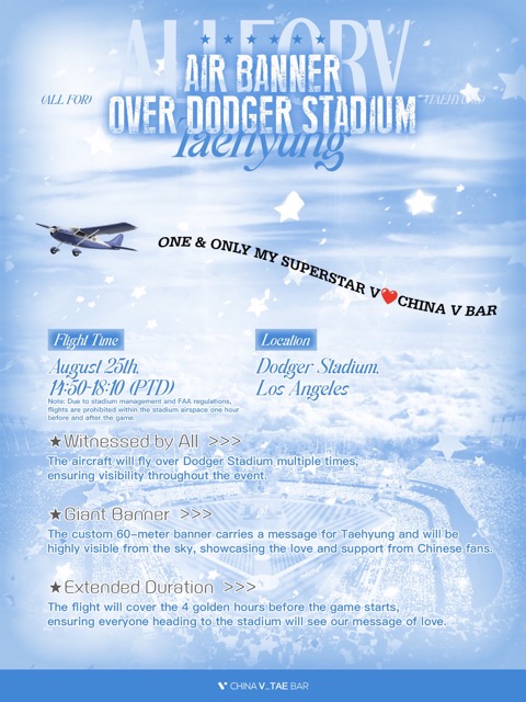 The most notable among these projects comes from the Chinese fan club “V Bar”: a plane will fly over Dodger Stadium multiple times, carrying a 60-meter-long banner with the message “ONE & ONLY MY SUPERSTAR V”, filling the skies with fans’ heartfelt tribute. The banner will be flown for four golden hours before the game, ensuring that everyone arriving at the stadium can see it.