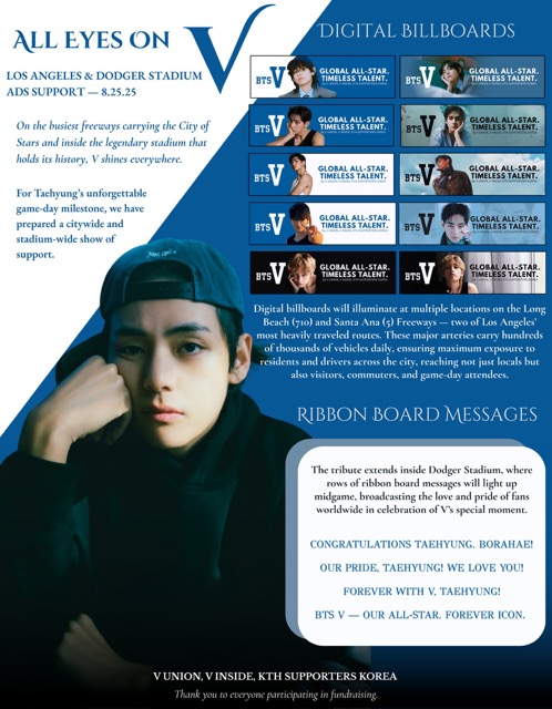 Many fan communities in many countries have also joined the ribbon board campaign, which both amplifies V’s presence and contributes meaningfully to society. The proceeds from the ribbon board messages will be donated to the Los Angeles Dodgers Foundation, supporting youth education, health care, homelessness relief, and social justice initiatives in Los Angeles.
