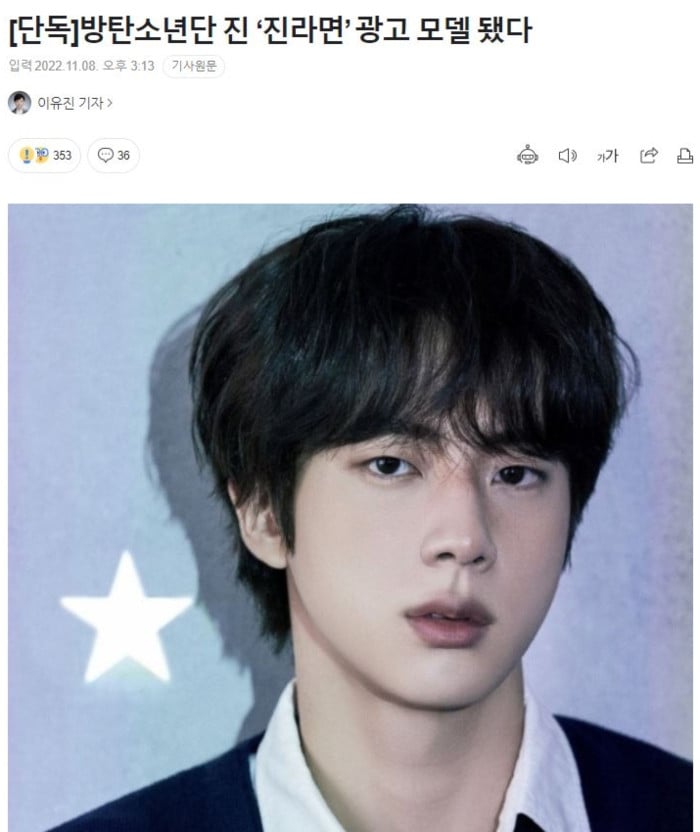 It was also pointed out that Jin is really well-suited to being a model for Jin Ramyeon's CF. Even on an online community forum, a netizen made a post titled "Jin's first individual brand CF...amazing."