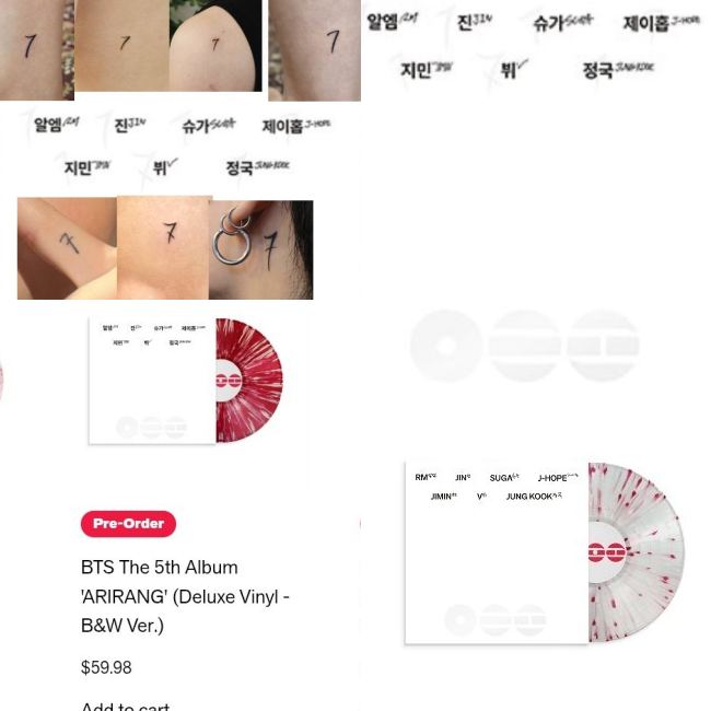 Beyond the attention drawn to BTS’s first official group photo since the members reunited, fans quickly noticed another surprising and meaningful detail. On the Deluxe vinyl gatefold outer sleeve, the tattoos of all seven members along with their signatures were prominently printed. This is considered the first time fans have been able to see all seven of BTS’s friendship tattoos up close in a single frame.