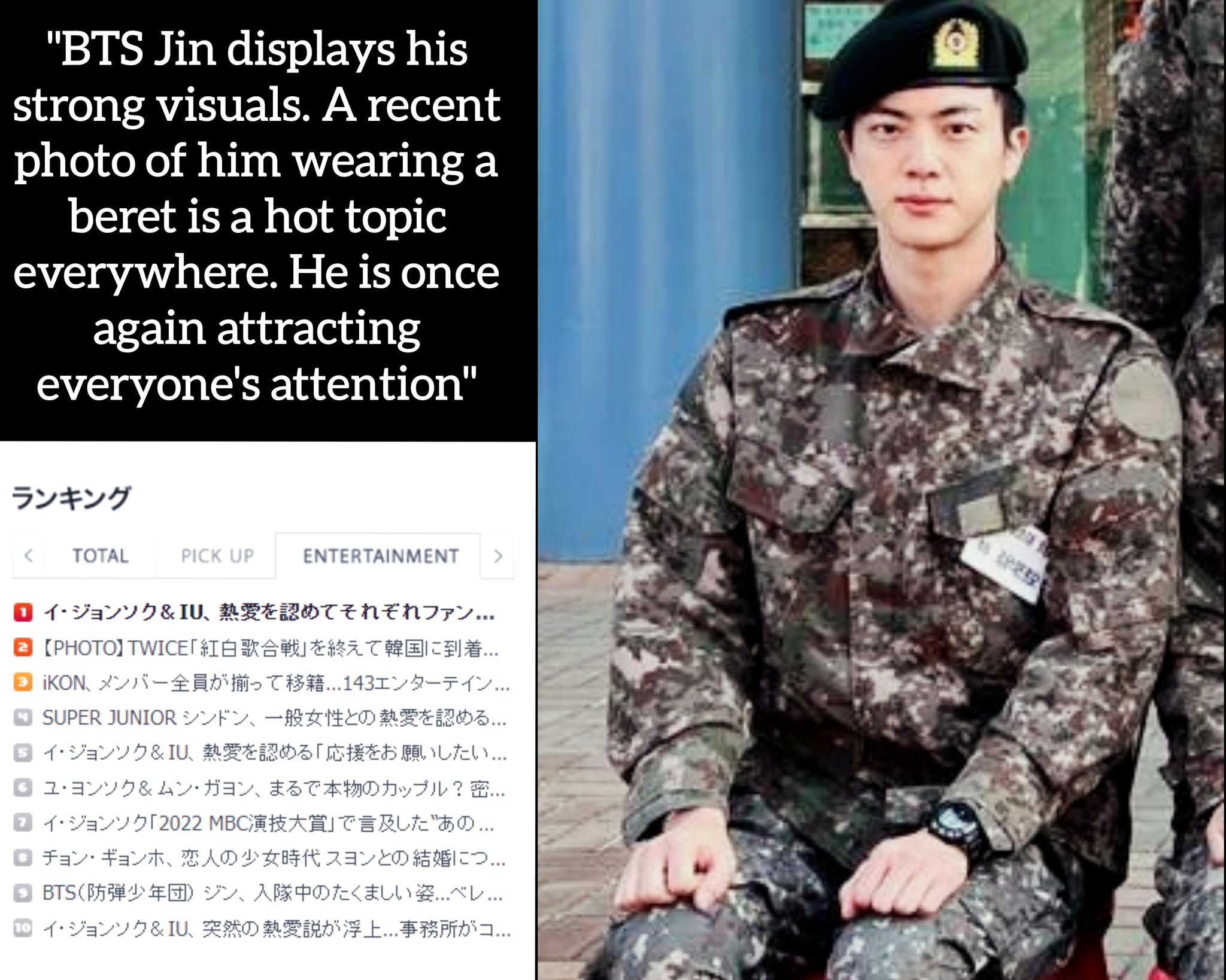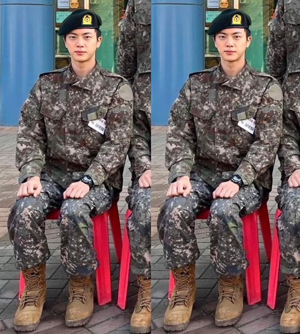 - "Jin took a picture with his fellow recruits, wearing beret in a ready/disciplined posture at the boot camp. His sparkly eyes, peachy skin tone and his small face in the released photo stand out, highlighting his unmatched 'Worldwide Handsome' visual."