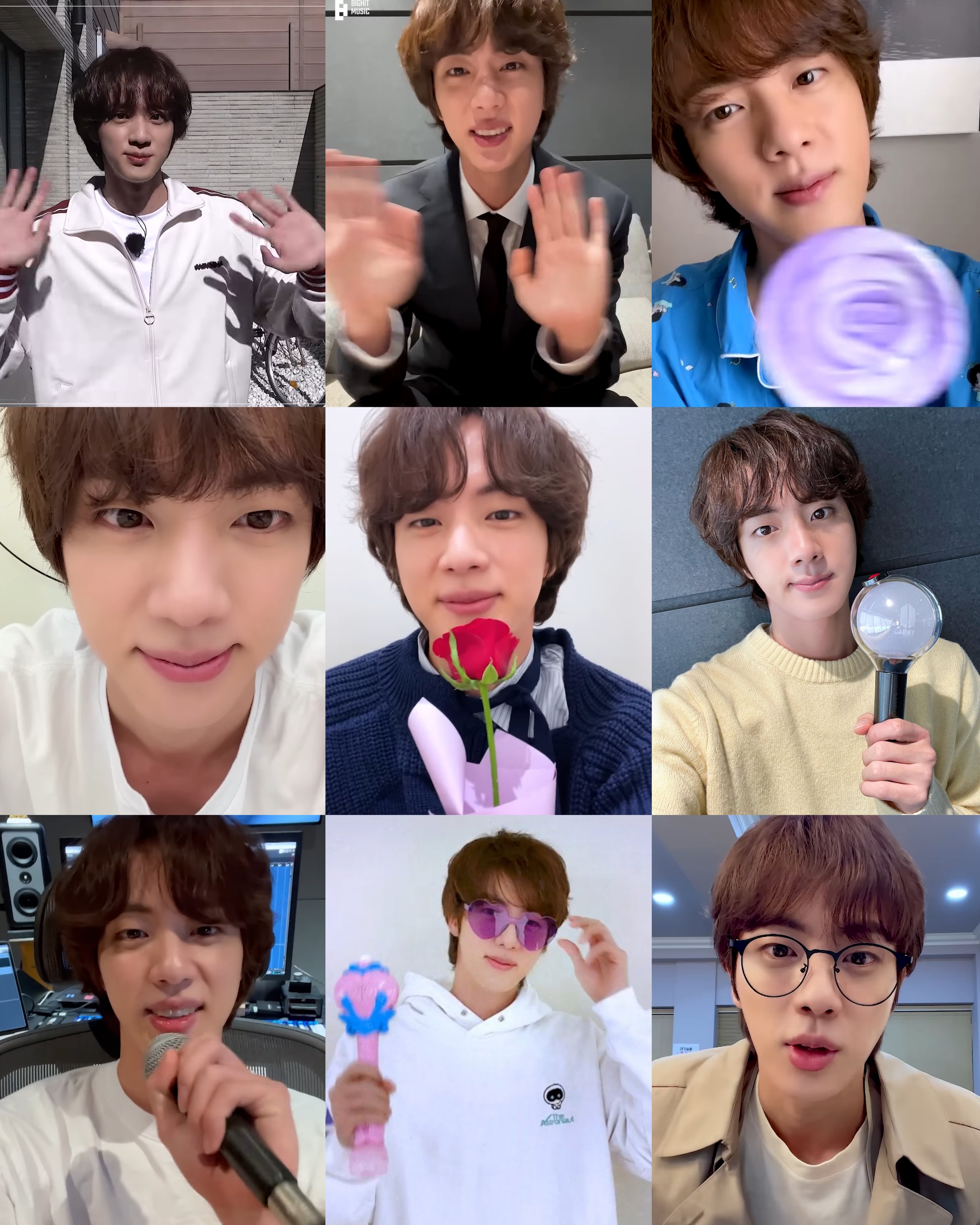 Each video is filmed in a few minutes with a random background but each of his messages is very meaningful. It can be a greeting for a new season, a message for an anniversary month or simply an emotional message...Every month, Jin's message videos always appear on Youtube Bangtan TV and they have been never missed for his fans.