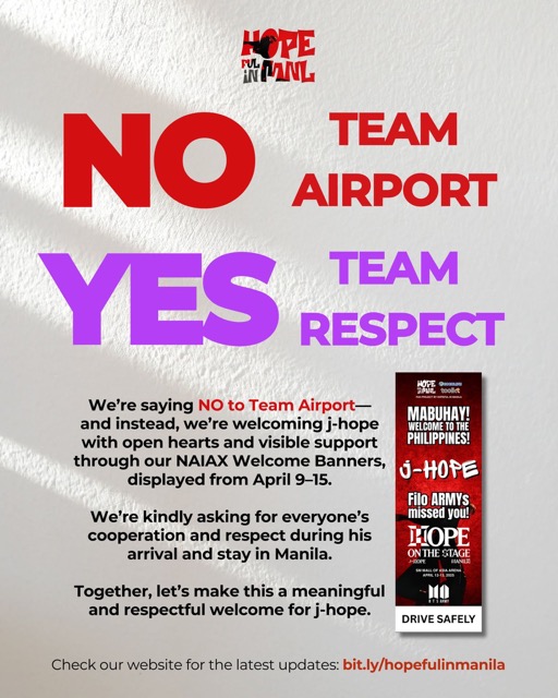 Amidst this rumor, many fans, especially local ARMYs, quickly spoke up to defend their idol. PH-ARMYs noted that they have organized a project calling on fans to stop coming to the airport when j-hope lands in Manila to show respect and bring a sense of safety to him since early April, called "NO TO TEAM AIRPORT".