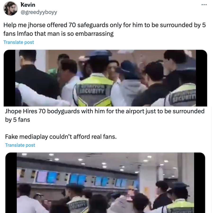 Because of this scene, some people accused j-hope's popularity here is low and it is not soмєтнing to brag about. Even having many bodyguards following j-hope when there are only a few fans chasing him is considered pretentious or "fake fame".