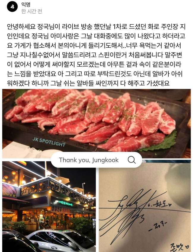 - How considerate of JK to sign for employees who weren’t there too. The Restaurateur’s friend spoke up for Jungkook when he didn’t have to. How kind & what a contrast to JK’s supposed fans (referring only to those spewing hate ostensibly as concern for the group comeback).