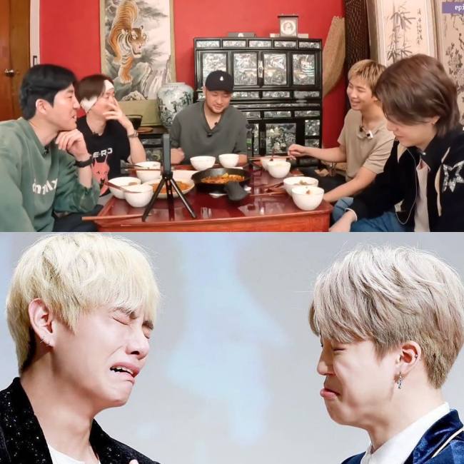 SUGA continued, "I was sitting nearby listening, and when things started getting heated, I called Jimin over and asked, 'What is this even about?' The funny thing is, because they were both drunk, they didn't even know exactly why they were arguing. But they were both huffing and puffing in anger," which drew laughter from the set.