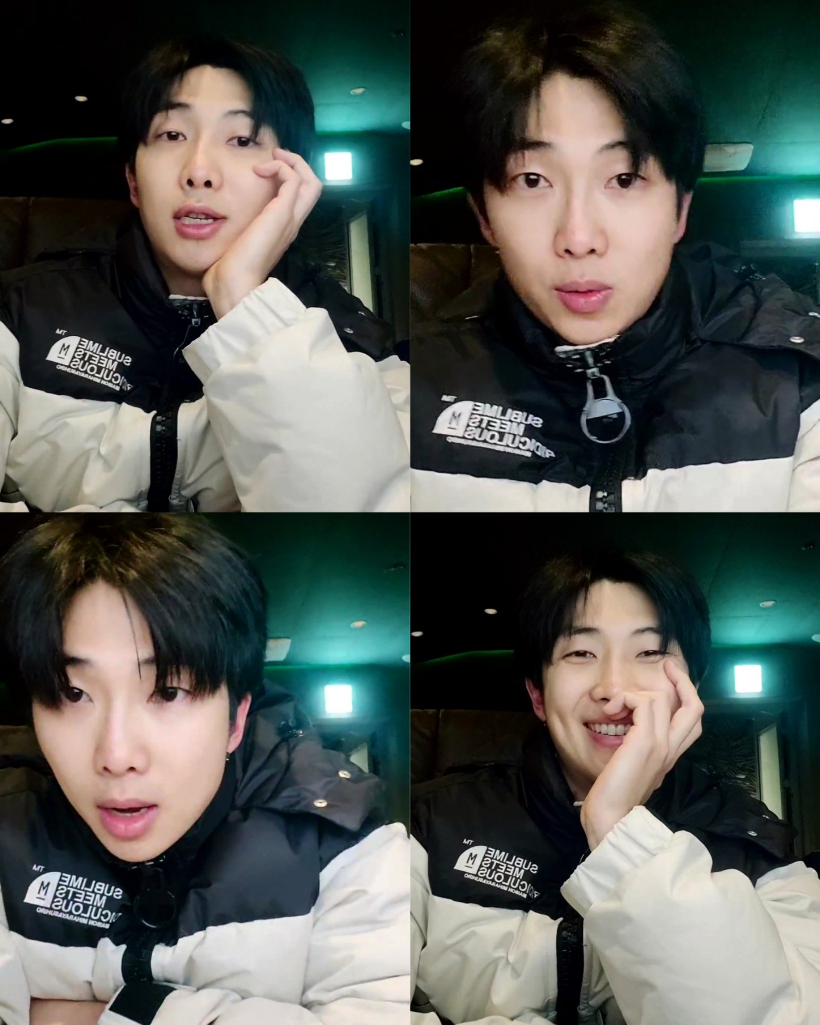 RM showed up with a warm jacket and he did a livestream in his studio. RM also shared that he was preparing to record but still wanted to stop by to meet ARMYs because the maknae line had a lot of fun doing a livestream recently.