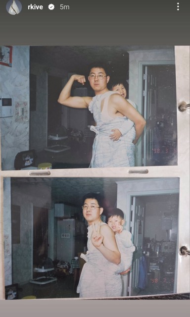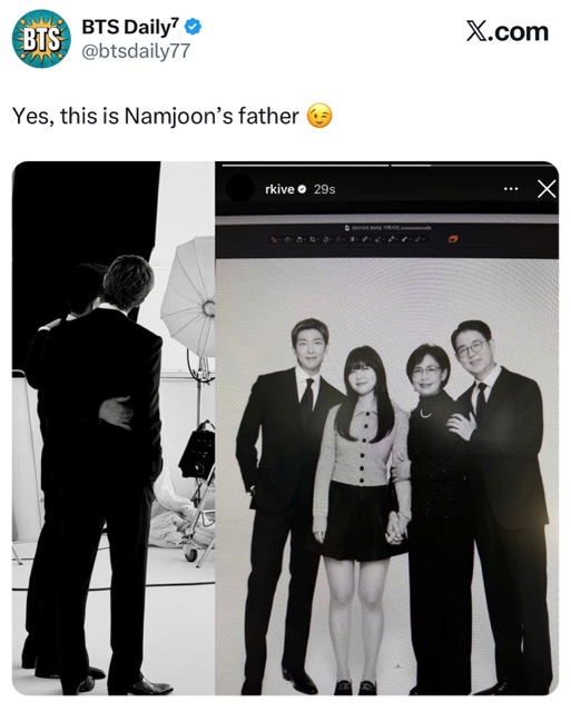 However, the initial confusion was soon replaced by a moment of heartfelt realization. Longtime fans quickly connected the dots using previously shared information. The man standing beside RM in the photo turned out to be none other than his father. Fans began comparing details and discovered clear overlaps with a set of family photos RM had shared in the past.