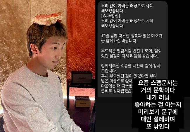 Specifically, on December 2, RM posted a screenshot of a spam message on his personal account, accompanied by a humorous caption: "These days, spam messages are practically literature. They must know I like running, because every preview makes my heart flutter… and I fall for it again."