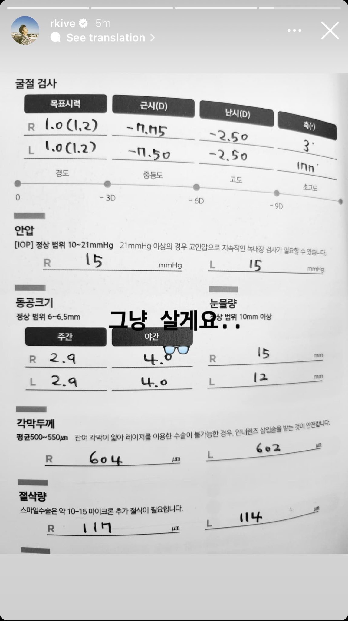 In an Instagram post, RM shared a vision test result sheet as an answer. According to the results, the idol suffers from severe myopia of over -11 diopters in both eyes, along with astigmatism of about -2.50 diopters. This level of eyesight is clαѕѕified as “high myopia,” significantly affecting his ability to see in daily life.