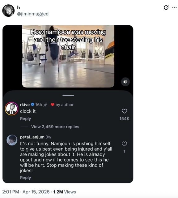 What made the situation particularly noteworthy was that RM’s brief comment appeared directly above a much longer comment written weeks earlier by another fan. This person had criticized the original poster, arguing that making jokes about RM’s injury was insensitive, and speculated that the rapper might feel hurt if he happened to see the video.