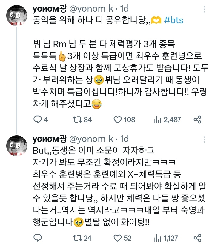 Specifically, she wrote a long post that: "Both of V-nim & RM-nim received three TEUK grades(*best/special?) in three events of the physical strength evaluation. If you receive more than three TEUK(*best) grades you will be selected as the best trainee and receive a reward vacation along with the listingon the day of completion! The award that everyone envies.