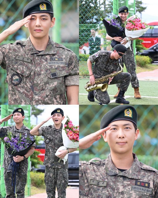 RM performed a performance to celebrate his discharge by playing the saxophone, as he served in the military band. V waved to ARMYs while holding a bouquet prepared by HYBE.