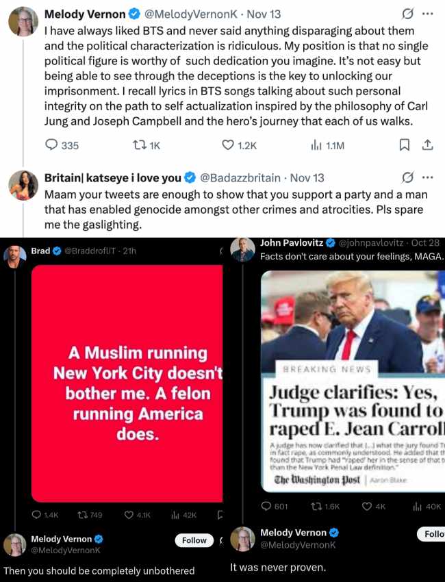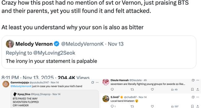 Several of Vernon’s mother’s other surprising replies also gained significant attention. These included tweets suggesting she disliked BTS, supported controversial United States President Donald Trump, and held Islamophobic views.