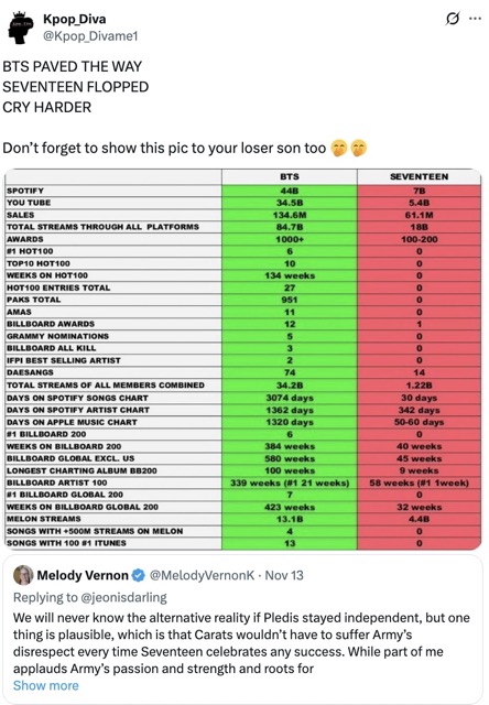 In her post, she referenced claims that HYBE had “used SEVENTEEN to compensate for the inevitable loss in revenue” once BTS members began enlisting for military service. She also surprised many people by adding that Big Bang or PSY—rather than BTS—should be considered the true “pioneers.”