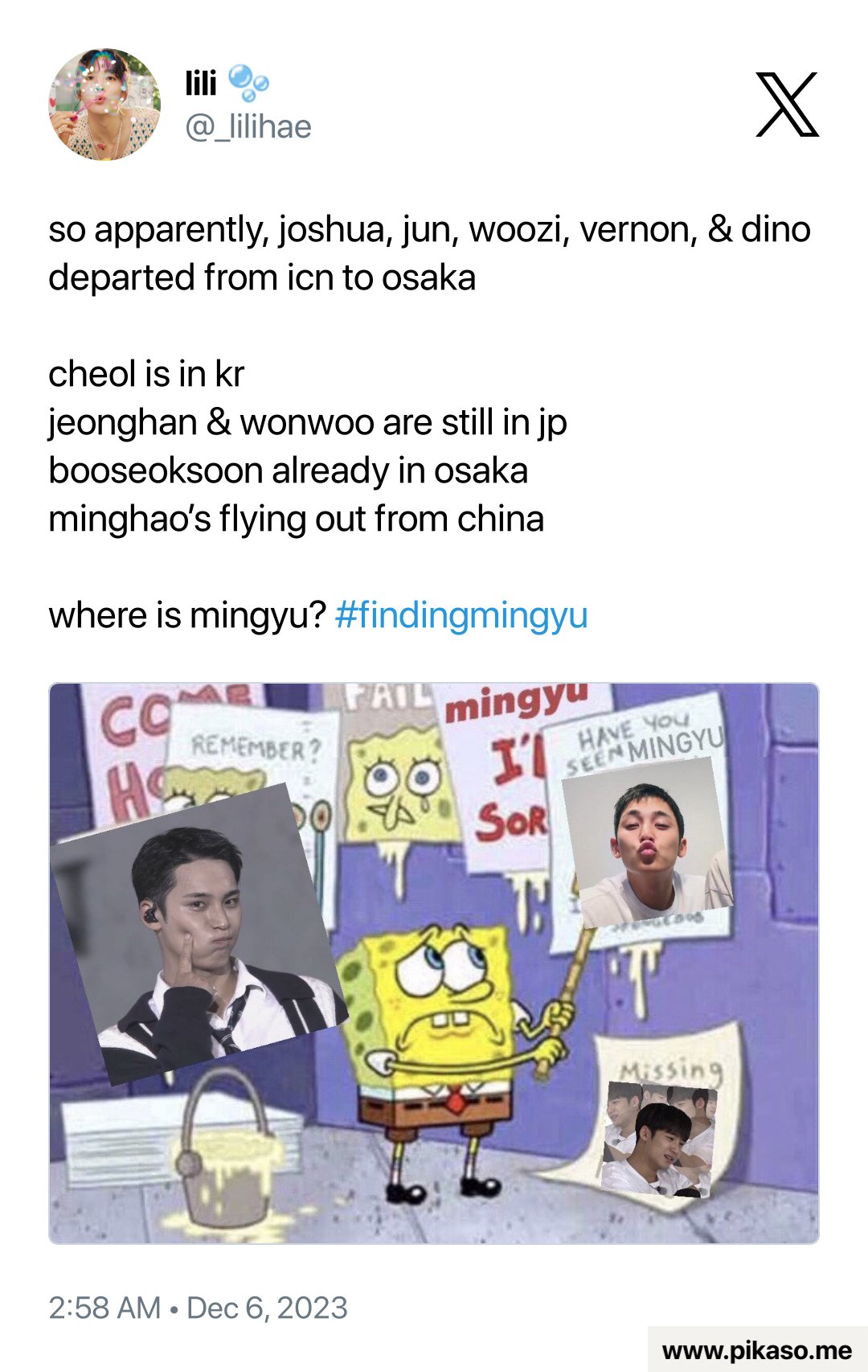 On December 6, the members in ̾k̾o̾r̾e̾a, minus Mingyu, were spotted at the airport, leading fans to question his location. Some hours later, a fan spotted Mingyu at Kansai Airport in Osaka alone besides management and security.