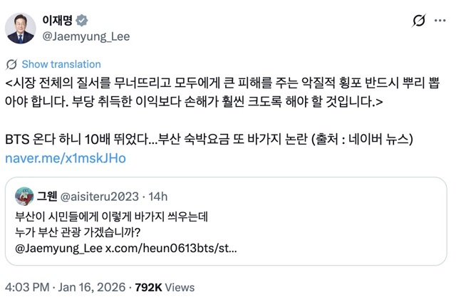 As the situation escalated and public anger spread rapidly across social media, South кσяєαn President Lee Jae Myung issued an official statement via his X (formerly Twitter) account, declaring: “Malicious practices that disrupt market order and cause serious harm to everyone must be eradicated. The losses must far outweigh any unfairly gained profits,” while quoting a Naver News article titled, “Prices Soar Tenfold at the News of BTS’s Arrival… Busan Accommodation Fees Spark ‘Price-Gouging’ Controversy Again.”