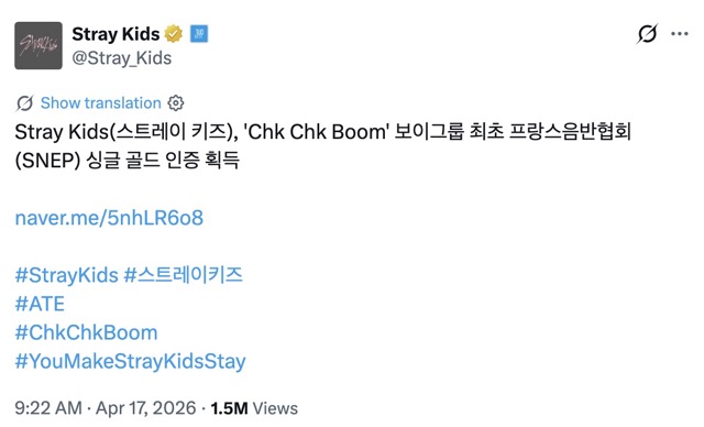 Specifically, on the 17th, Stray Kids’ official account posted an update announcing a new achievement with the English caption: “Stray Kids Becomes First Boy Group to Achieve SNEP Gold Single Certification with ‘Chk Chk Boom’,” along with a link to a Naver article elaborating on the accomplishment. The post quickly gained traction, but surprisingly, most reactions were negative.