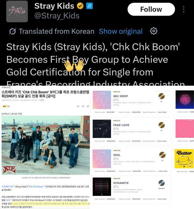 In fact, the truth differs entirely from the statement made on Stray Kids’ X official account. BTS were actually the first K-pop boy group to achieve this milestone, having earned three Gold certifications for Fake Love, Boy With Luv, and Mic Drop. This also aligns with the article’s description that Stray Kids are the second K-pop boy group to receive a SNEP Gold certification with “Chk Chk Boom.” Beyond Gold certifications, BTS have also received a Platinum certification for Butter and two Diamond certifications for Dynamite and My Universe.